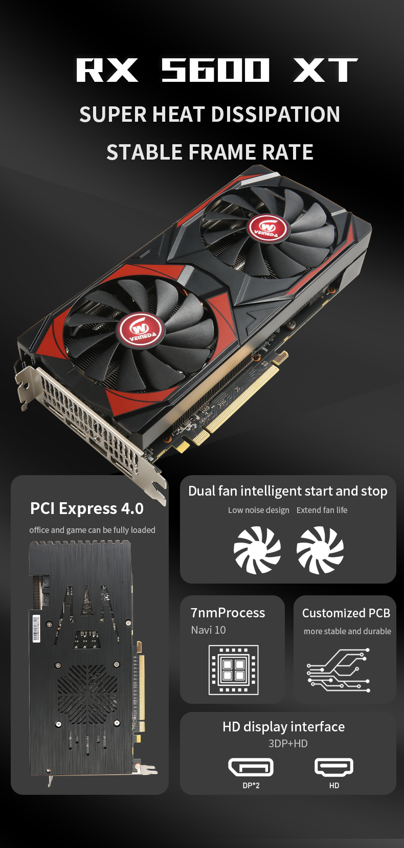 Veineda Graphics Card RX 5600XT 6GB GPU GDDR6 192Bit 8pin7nm DP*3 HDMI*1 Video Card Support Desktop CPU placa de video