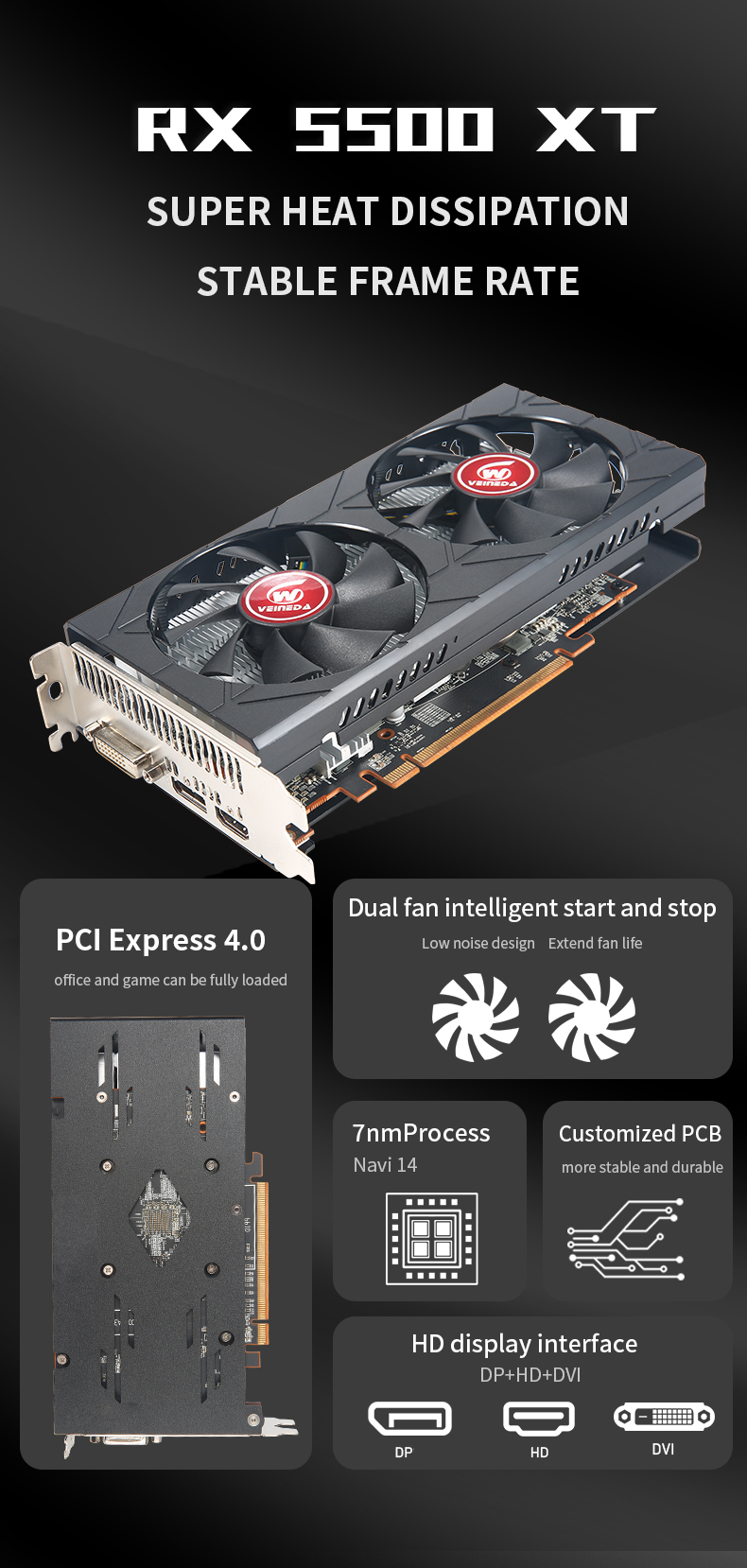 Veineda Graphics Card RX5500XT 8G Gaming Graphics Card 8GB 128Bit GDDR6 PCI-E 4.0×8 GPU AMD Radeon RX 5500 XT 8gb game Video Card